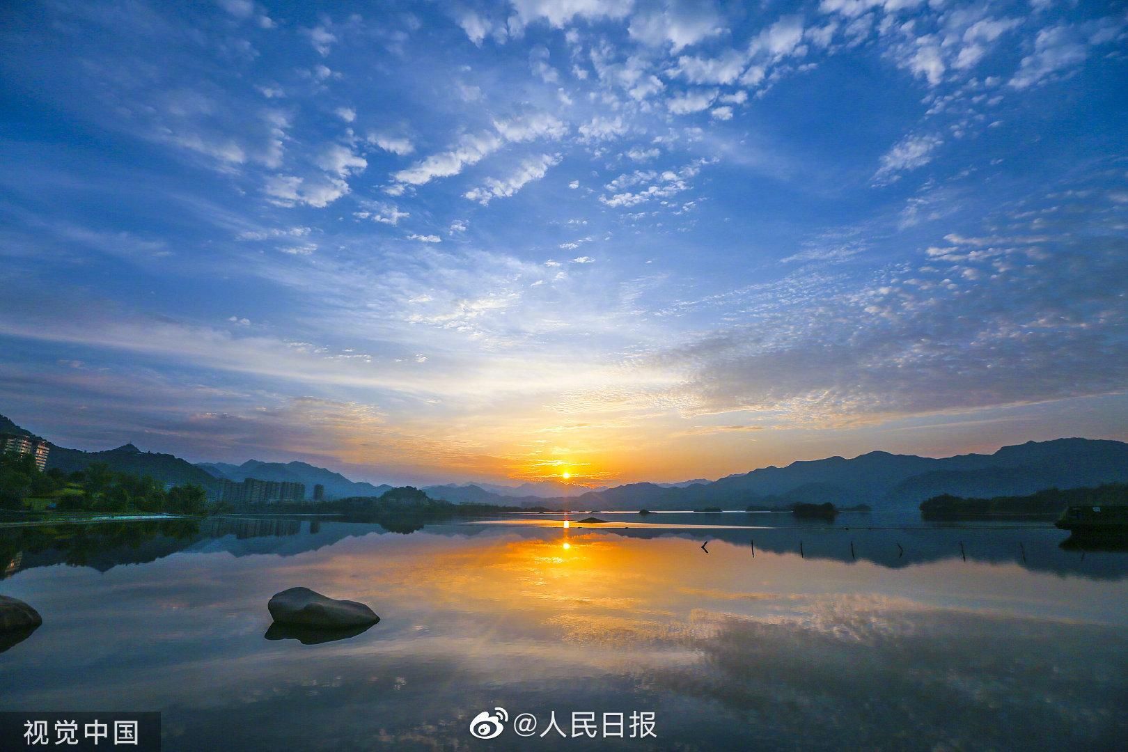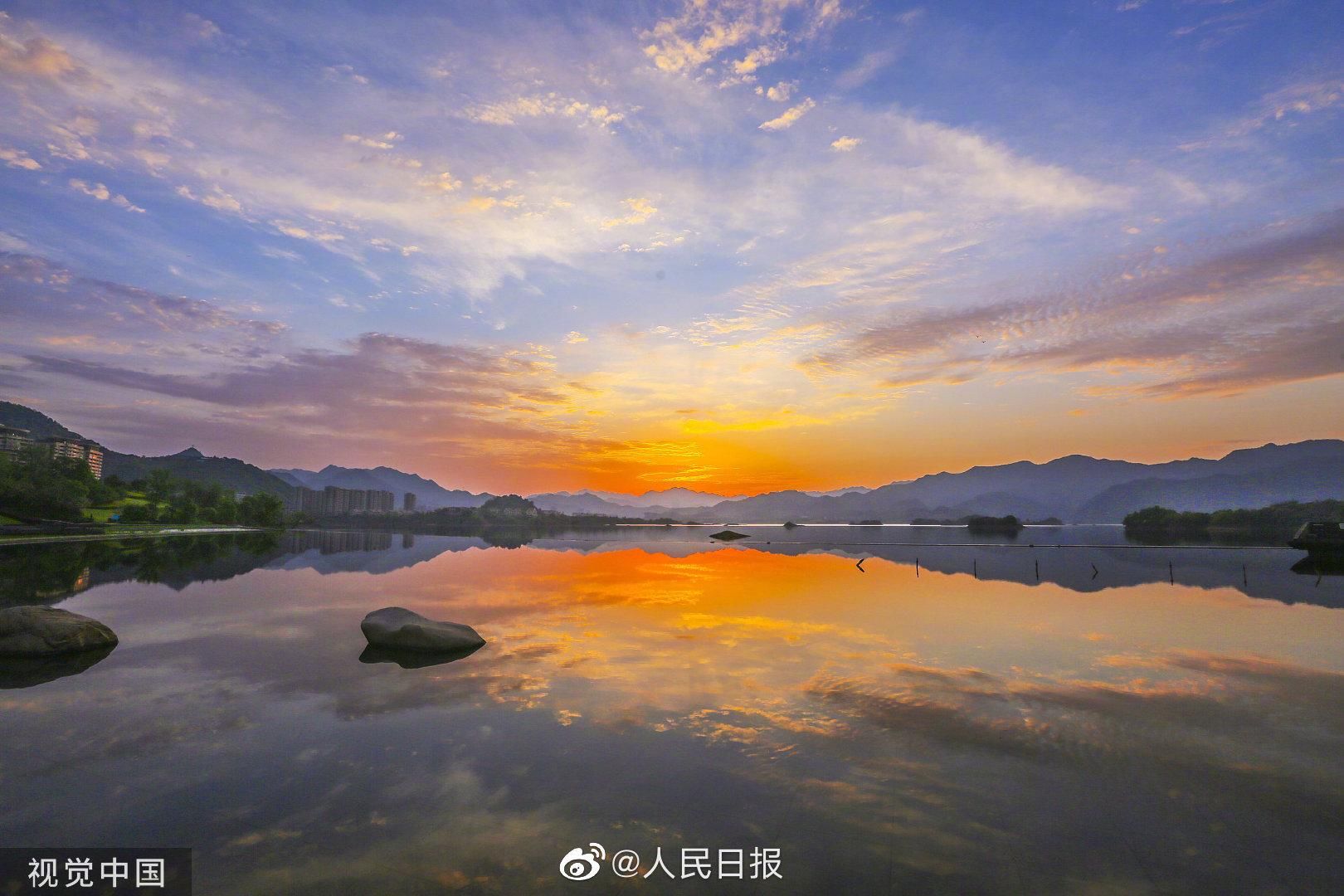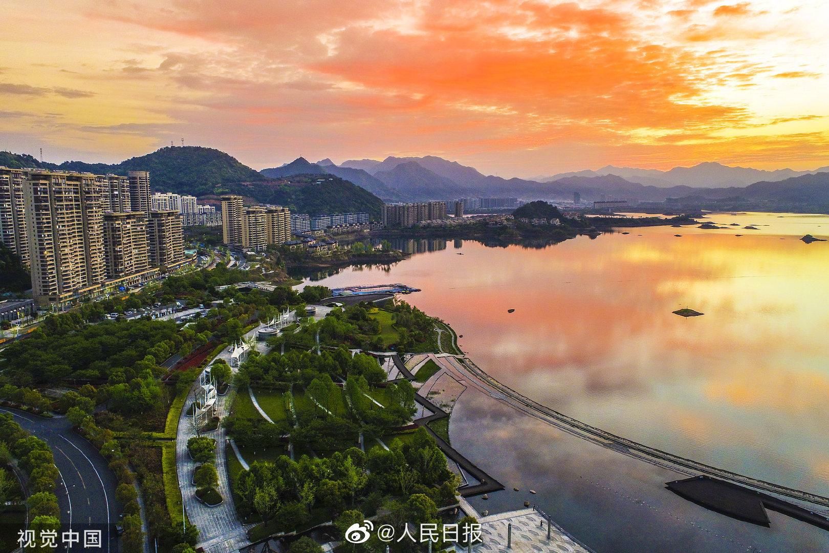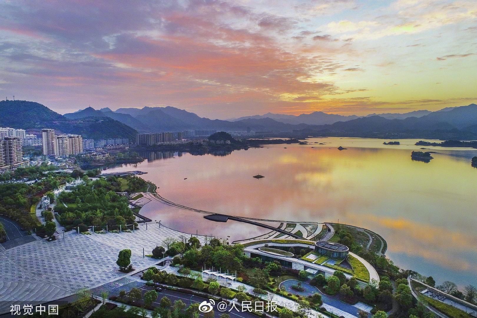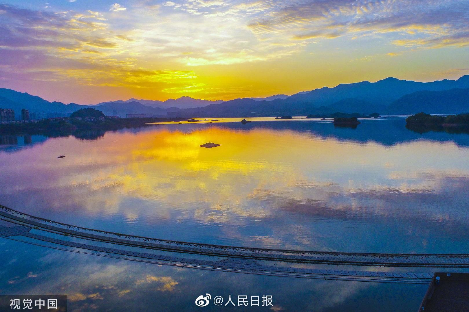 #可爱的春天#【#杭州千岛湖彩霞映红湖面#】4月10日清晨,浙江杭州淳安县珍珠广场,#千岛湖彩霞漫天如油画#。